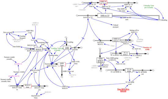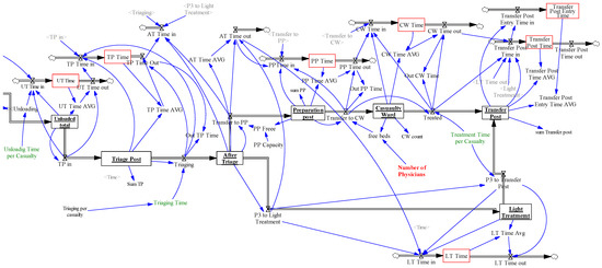 AMB on TP Time stocks represent the co-flows to calculate the average time spent by casualties in corresponding stocks. These stocks are represented as red boxes in