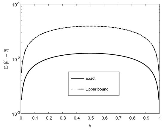 Figure 1 and Figure 2 display plots of as a function of and n, in comparison to the upper bound (40). The difference in the plot of Figure 1 is significant except for the boundaries of the interval , where both the exact value and the bound vanish. Figure 2 indicates that the exact value of , for large n, scales like ; this is reflected by the apparent parallelism of the curves in both graphs and by the upper bound (40).