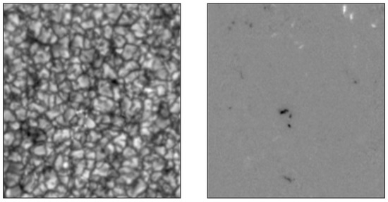 where K is the average temperature of the solar photosphere (assuming the Sun as a black body) and is the average intensity for each spectral scan. A sample of the temperature fluctuation maps is reported in Figure 3 (right panel). We assume that the evaluated temperature fluctuations are associated with the base of the solar photosphere within the photon mean free path (≈70 km [59]), considering that we make use of broadband images to compute them via the Stefan–Boltzmann law.