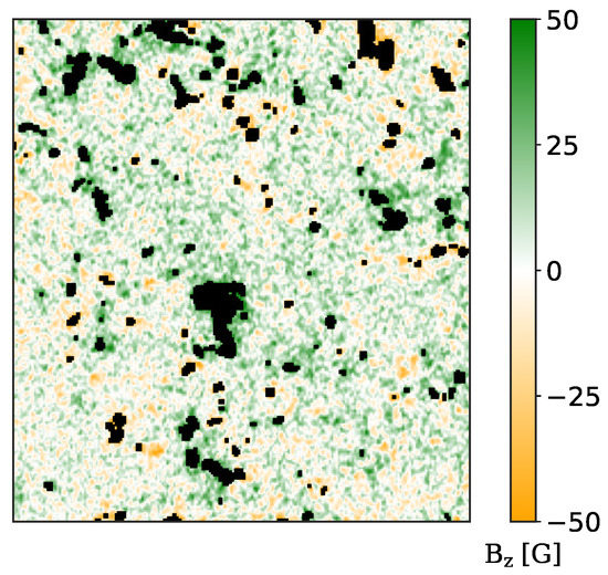 Sample map of the magnetic field intensity (vertical component) evaluated using the CoG method applied to the Fe I 630.15 nm spectral line. Black pixels have a magnetic field intensity greater than 50 G and are excluded from our analysis.