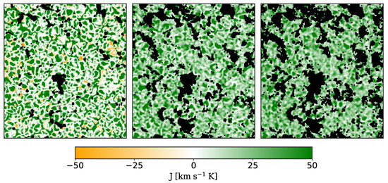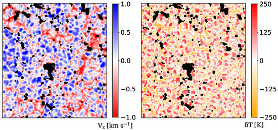 where the integral is extended over the entire line profile. A sample of the velocity maps is reported in Figure 3 (Left panel). The temperature fluctuations , with respect to the mean photospheric temperature, are computed from the broadband images by applying the Stefan–Boltzmann black body radiation law [57,58]:
