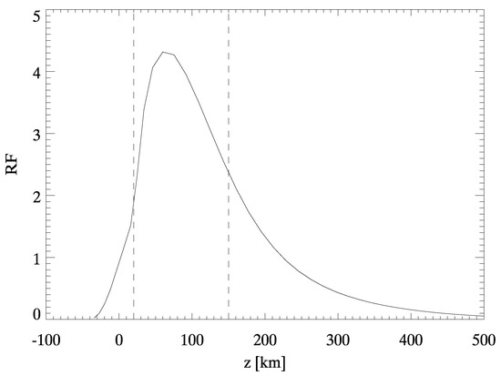 Response function (RF) of the vertical velocity for the Fe I 630.15 nm spectral line, averaged over the sampled spectral points of the observation. Adapted from [55].