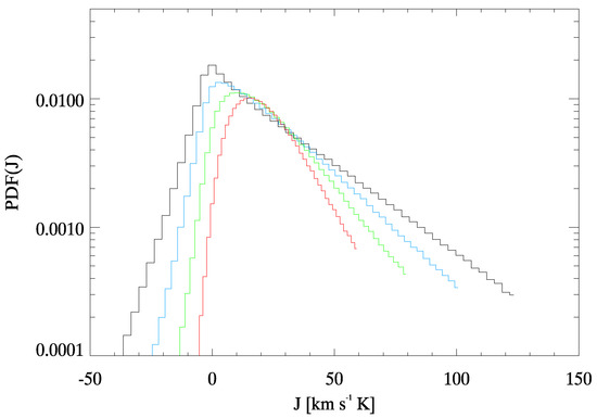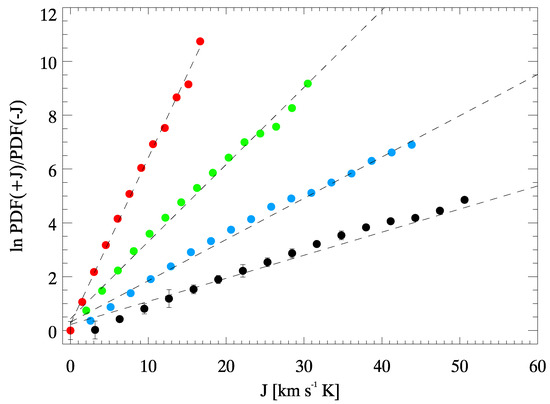 In Figure 7 we show the logarithmic ratios of the PDF as a function of J for the same PDFs shown in Figure 6. We also plot the relative linear fits as dashed lines. We can notice that a clear linear dependence is recovered as predicted from GCFR (see Equations (4) and (5)) and that the slope steepens as increase.