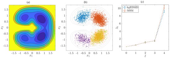 It was shown that gEDMD, in the infinite data limit, converges to a Galerkin projection of the generator onto the space spanned by the basis functions and that is an empirical estimate of the projected generator []. Approximations of eigenfunctions of are then given by: