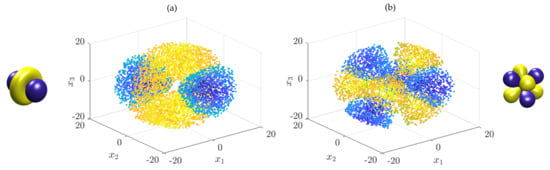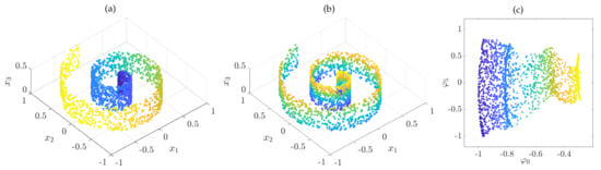 We consider the well-known Swiss roll; see, for instance, []. The goal is to parametrize the two-dimensional manifold. We use kernel density estimation, cf. [], and a Gaussian kernel with bandwidth to learn , i.e.,