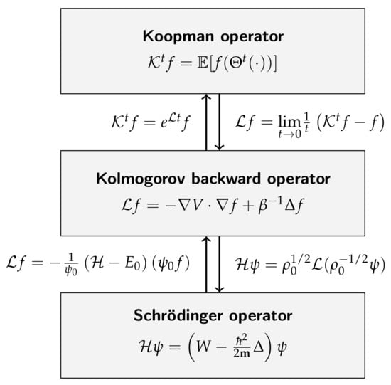 We note for later use that, under certain conditions, Schrödinger operators and Koopman generators are equivalent; see, e.g., ([] Chapter 4.9). For the sake of completeness, the proof is shown in Appendix A.