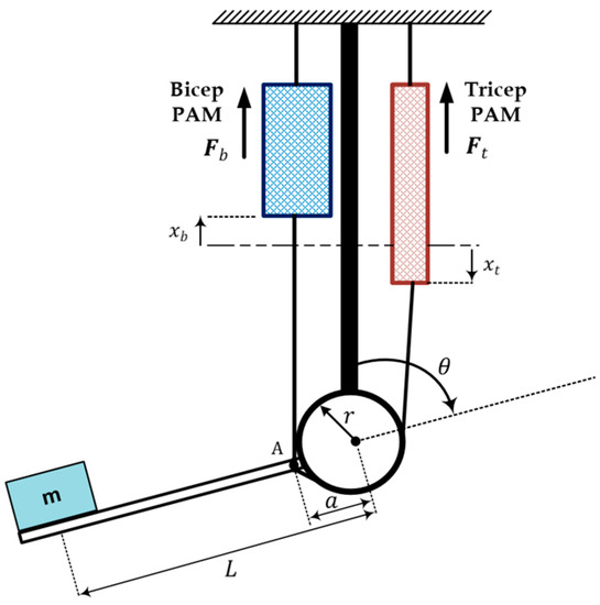 where, is the mass (kg), is the gravitational acceleration (), is the bicep coefficient of viscous friction, is the length of the arm from the center of the mass to the joint, is the tricep coefficient of viscous friction, represents the bicep spring coefficient (), represents the tricep spring coefficient (). is the force exerted by PAM in the bicep case, is the force exerted by PAM in the tricep case, is the distance from the joint axis of rotation to the PMs attached point (A), r is the pulley radius.