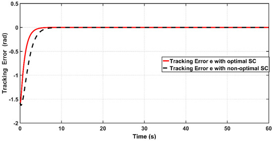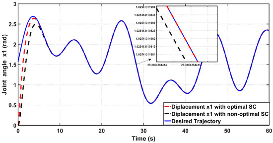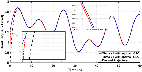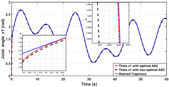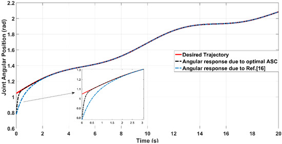 Figure 18 shows the tracking performance of the controlled PAM-actuated robot arm based on the optimal adaptive synergetic controller and the compared controller. Starting from the same initial joint condition, it is clear that the joint angular response based on optimal ASC is faster than that based on its counterpart. The angular position resulting from optimal ASC reaches the desired trajectory in 0.65 s, while it coincides with the desired trajectory in 2.5 s in the case of the compared controller. The calculation of RMSE is the other index of evaluation, which is used for comparison. It has been found that the RMSE due to optimal ASC is equal to 0.0147 rad, while this value is equal to 0.0278 rad in the case of the compared controller. This numeric report indicates that the proposed adaptive ASC gives better tracking performance than that given in the previous work.