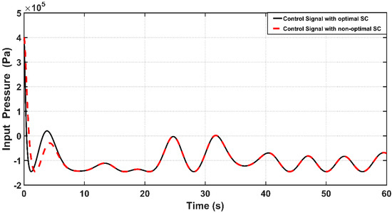 The corresponding control effects based on optimal and non-optimal CSC are depicted in Figure 10. One can evaluate the energy or control signal exerted by both controllers by calculating the RMS of the control signal over the entire simulation time. It has been shown that the RMS value of pressure input (control signal) is equal to for the optimal controller, while the value of RMS of the control signal for the non-optimal controller is equal to (). This indicates that the optimal controller takes more energy than that based on the non-optimal one. This is the price paid by the optimal controller to have a better dynamic response.