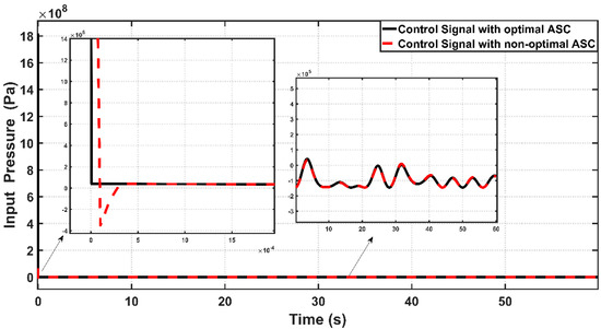 Figure 14 combines the effects of ASC control signals due to optimal and trial-and-error procedures. It is interesting to calculate the input pressure variances based on the proposed controllers to evaluate the amount of pressure absorbed by the controlled system. The RMS values of control signals over the entire time of simulation resulting from optimal ASC and non-optimal ASC areand , respectively. It is clear that the input pressure taken by optimal ASC is higher than that absorbed by non-optimal controller; this is the price which has to be paid by the optimal controller to have better dynamic and tracking performance.