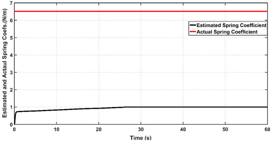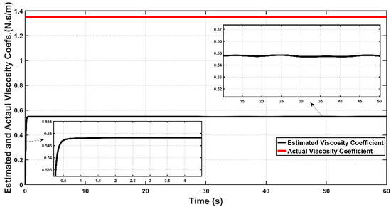 Figure 16 and Figure 17 show the actual and estimated values of viscosity coefficient and spring coefficient for bicep muscle, respectively. The boundness of the estimation errors of uncertain parameters is one of the essential issues in evaluating the performance of adaptive design for most adaptive controllers. If the adaptive control lacks the ability to confine the estimation errors within certain bounds, then the stability of controlled system may be violated. Based on the figures, one can determine the bounds of to be and to be for . One can conclude that ASC could successfully confine these coefficients within bounded values over the simulation time, and hence the adaptive controller could avoid the instability problem which may arise due to the drift of uncertainty in system parameters.