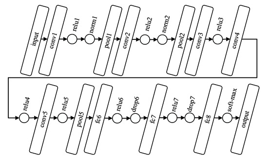 The original architecture of AlexNet is displayed in Figure 3. As can be seen, the algorithm is composed by eight layers with ability to learn, i.e., five convolutional and three fully connected ones [58]. After these layers, common ReLU activation functions (relu1, relu2, relu3, relu4, relu5, relu6, and relu7) are found. The first convolutional layer (conv1) filters the 227 × 227 × 3 fixed-size input image with 96 kernels of size 11 × 11 × 3. Then, the output is normalized (norm1) and pooled (pool1) before being inputted to the second convolutional layer (conv2), which filters the feature space with 256 kernels of size 5 × 5 × 48. Next, the feature space is again normalized (norm2) and pooled (pool2) before reaching the third convolutional layer (conv3), which filters the feature space with 384 kernels of size 3 × 3 × 256. The fourth and fifth convolutional layers (conv4 and conv5) present 384 and 256 kernels, respectively, both with the same size of 3 × 3 × 192. After a pooling layer (pool5), three fully connected ones (fc6, fc7, and fc8) are connected in cascade with two intermediate drop-out regularizations (drop6 and drop7). Finally, the last fully connected layer feeds a 1000-way soft-max function, which computes the probability distribution of belonging to 1000 output classes. In the present study, this final function was modified to produce a two-class output.