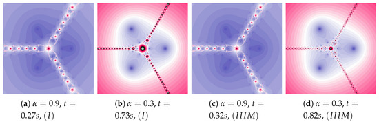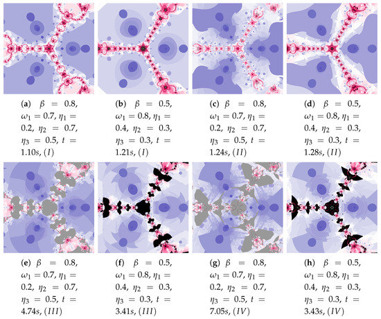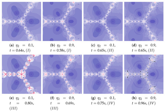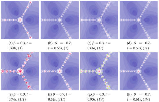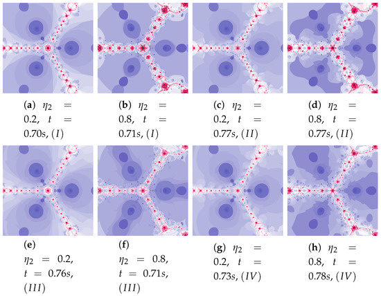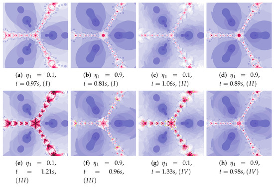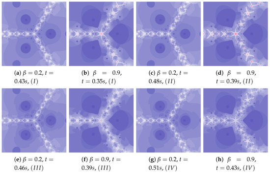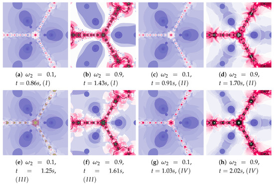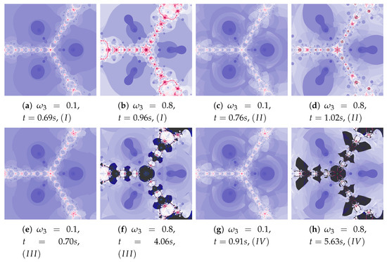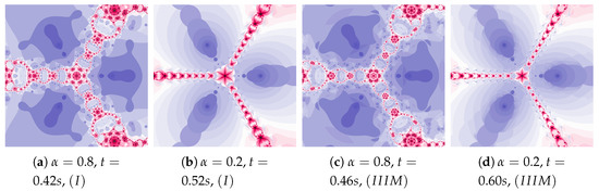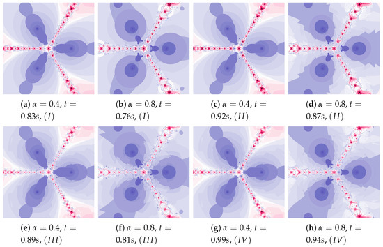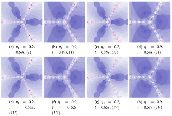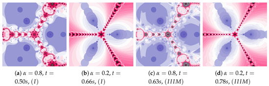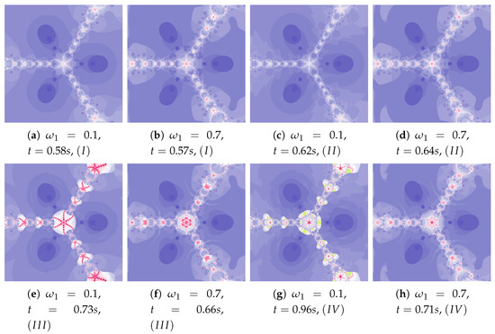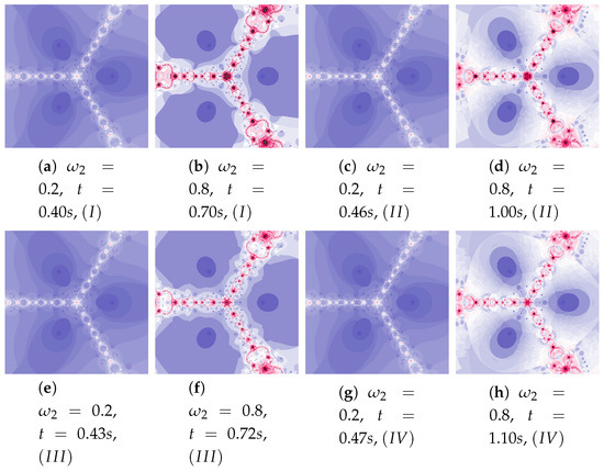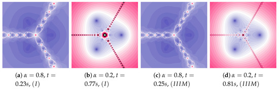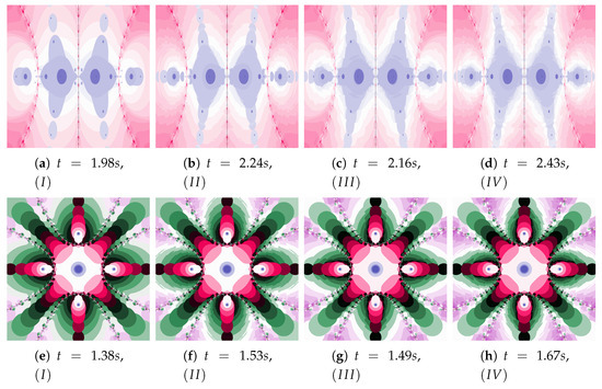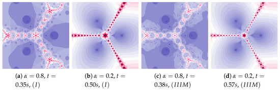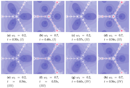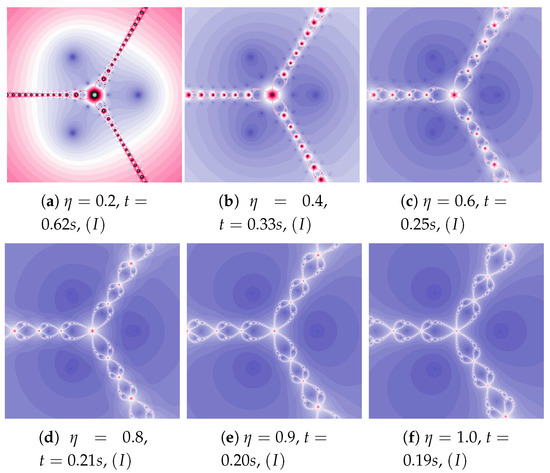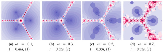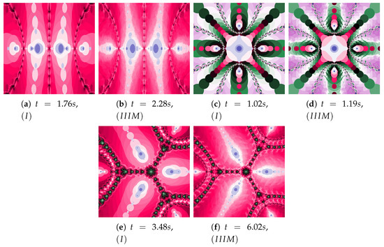 The motion of particles depends on the acceleration constant () and inertia weight (). These parameters control dynamics of a particle behaviour. The polynomiograph visualises particle dynamics and allows analysing parameters impact on the algorithm’s operation. Polynomiographs are created using Algorithm 1. The dynamics visualisations for the Picard iteration using and varying are presented in Figure 2. Earlier, in Section 2, we noticed that the proposed method reduces to the relaxed Newton’s method for and and to the Newton’s method for and , so Figure 2a–e present polynomiographs for the relaxed Newton’s method, whereas Figure 2f for the classical Newton’s method. The polynomiograph generation times are also given in Figure 2. The time decreases as the dynamics controlled by the acceleration constant increases.