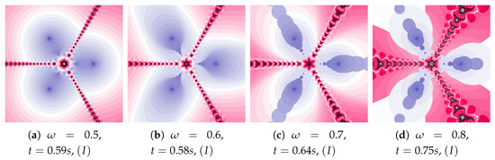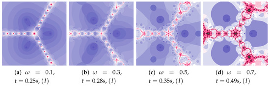 Polynomiographs of the Picard iteration for low value of acceleration constant () and varying are presented in Figure 3. The increase in the inertia weight results in the increase in particle dynamics. Both too small and too high particle dynamics cause the increase in the polynomiographs creation time. The shortest time was obtained for Figure 3b. Every change of dynamics creates a new image.