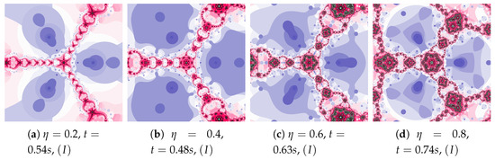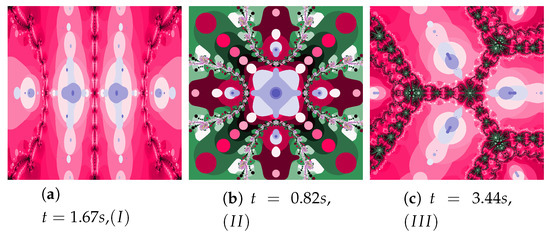 Polynomiographs of the Mann iteration for , and varying are presented in Figure 9. A small value of causes a reduction in particle’s dynamics. When Algorithm is used, the areas with the higher dynamics (areas of dynamically changing pattern) are narrowed (compare Figure 9a with Figure 9c).