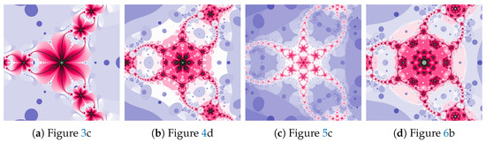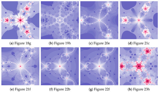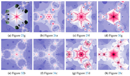 The magnifications of the central part of selected polynomiographs of Agarwal and Khan–Cho–Abbas iterations are presented in Figure 35. High dynamics can create interesting patterns, especially for the Agarwal iteration. These patterns can be an artistic inspiration.