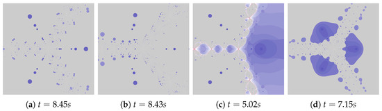 Polynomiographs of the Picard iteration for a constant value of the inertia weight () and varying acceleration constant are presented in Figure 6. For the images in Figure 6c,d the dynamics presented by the polynomiographs is high (the parts of the image are blurred—there are non-contrast patterns created by the points). Moreover, let us notice that the generation time for Figure 6a is lower than the time obtained for Figure 2a ( s—the Picard iteration with , ). Thus, by increasing the inertia we were able to obtain a shorter time than in the case of the relaxed Newton’s method with the same value of acceleration.