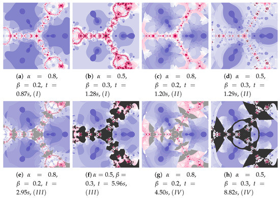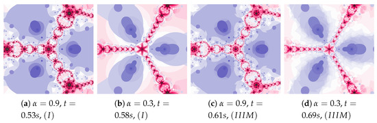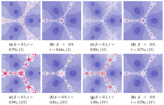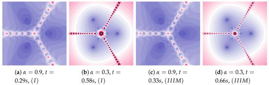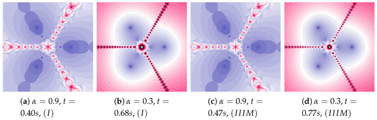 A very similar method to the polynomiography [44] is used to visualise the dynamics of the proposed algorithms. The iteration methods presented in Section 3 are implemented in the algorithms and proper values of parameters are selected. , for a single mapping or and for (depending on the chosen iteration). The maximum number of iterations m which algorithm should make, accuracy of the computations and a colouring function are set. Then, each in the solution space is used in the algorithm. The iterations of the algorithm proceed till the convergence criterion: