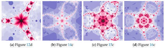 All the algorithms make characteristic changes in polynomiographs shown in Figure 23. For high value of the polynomiographs created by Algorithms and are similar (see Figure 23d).