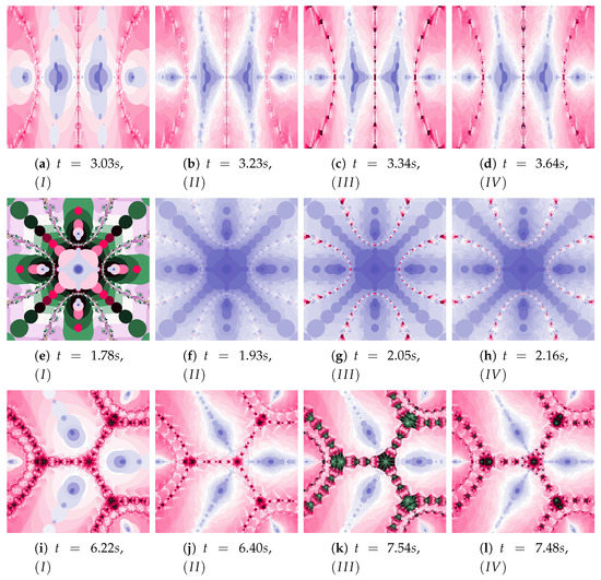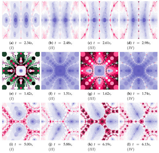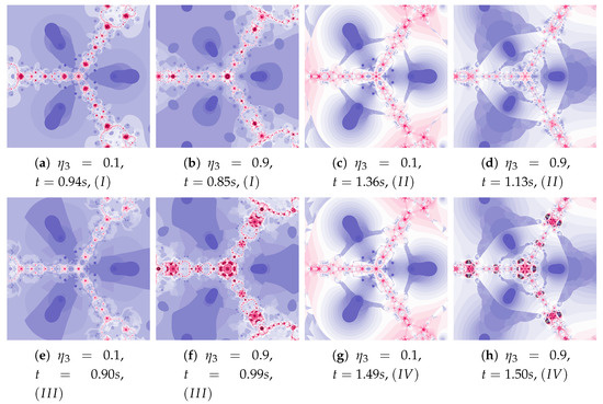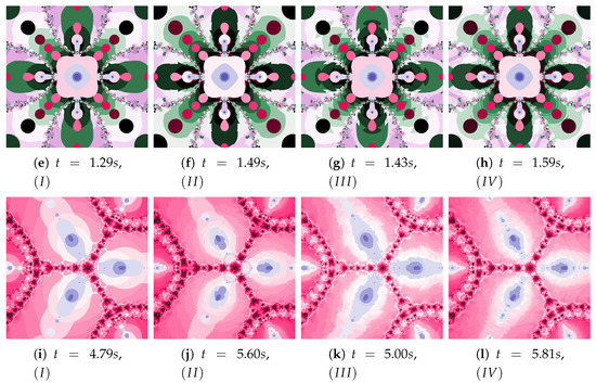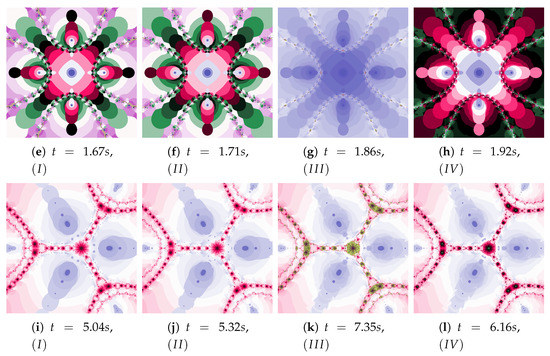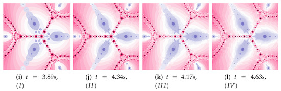 The generalised Agarwal iteration introduces three operators parameters of which can be independently specified. It allows for a wide range of changes in particle’s dynamics. In addition, and parameters allow to determine the impact of these operators on the algorithm work. In Figure 25 polynomiographs of the Agarwal iteration for varying and in Figure 26 for varying are presented. Incorrect selection of these parameters can cause that the algorithm does not reach a solution in a given number of iterations—it results in extension of the algorithm’s operation time (see Figure 25e). Nevertheless, the increased particle dynamics gives the opportunity to obtain interesting patterns. Poorly selected particle dynamics can cause a significant increase in the creation time of a polynomiograph. This case is visible in the polynomiographs in Figure 27 and Figure 28 for Algorithms and .