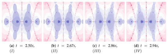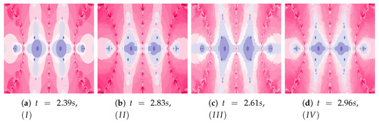 Depending on the choice of parameters, cases that have already been discussed in the previous iterations can be observed. The big similarity of polynomiographs created by Algorithms I and as well as and is observed in Figure 29 and Figure 30 (). Polynomiographs are similar for all algorithms with the low particle dynamics—this is observed in Figure 31. The strong similarity of polynomiographs is shown in Figure 32 and Figure 33 for Algorithms and —it indicates a strong influence of the reference point on the polynomiographs creation. Next, the strong similarity of polynomiographs is observed in Figure 34 for Algorithm I and —it results from the strong influence of the best particle position on the polynomiographs creation.