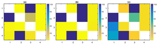 The percentage of significant (a) PTE, (b) PTENUE, and (c) LATE values, over the 100 realizations of the chaotic coupled system in variables with coupling strength and . The direction of causal influence is from row to column in the matrix representation.