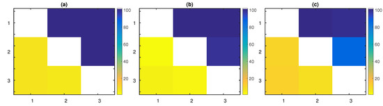 The percentage of the significant (a) PTE, (b) PTENUE, and (c) LATE values, over the 100 realizations of the nonlinear stochastic system with . The direction of causal influence is from row to column in the matrix representation. The true causal connections are at the matrix elements (1,2), (1,3), and (2,3).