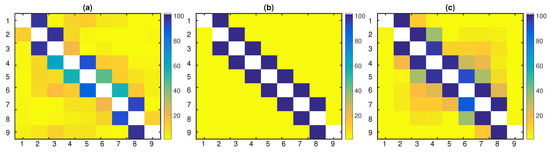 As the dimensionality of the chaotic system increased, PTE required larger time series lengths to detect the true connections with a high percentage over the 100 realizations. Indirect causal effects were obtained with low, but slightly increasing percentages as the time series length grew. The spurious couplings and also arose as n grew. The matrix representation of the extracted significant causal influences based on PTE as a percentage over the 100 realizations of this system with is displayed in Figure 4a. The sensitivity of PTE increased from 32% (for ) to 99.79% (for ) and affected its overall performance (Table 4). The highest mean F1-score for PTE was achieved for . Its specificity was high; however, it started to decrease from .