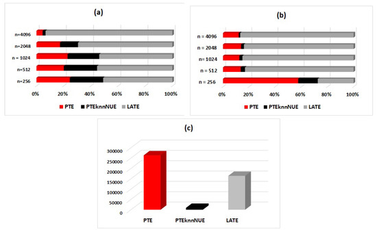 The computational cost (in seconds) of the causality measures PTE, PTENUE, and LATE displayed by 3D 100% stacked bars of (a) the nonlinear stochastic system (S2) in 3 variables, (b) the chaotic system (S3) in 9 variables, and (c) the chaotic system (S3) in variables.
