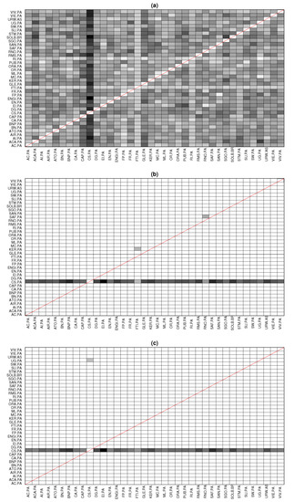Extracted causal links of CAC40 based on (a) PTE, (b) PTENUE, and (c) LATE. Rows drive the columns. The diagonal of this matrix representation is marked in red.