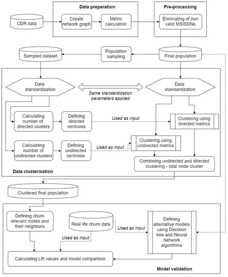 The paper is further organized as follows. The next section presents the comparison with the related work. Section 3 contains a brief description of the idea behind the entire process. Additionally, in Section 3 we also present metrics that will be used for numerical description of the call graph nodes. In Section 4 we describe our datasets, the process of creation of the call graphs and a method for eliminating not valid nodes. The process of Mobile Station International Subscriber Directory Number (MSISDN—a number uniquely identifying a subscription in a mobile network) clustering is also presented in Section 4. In Section 5, we define the final prediction model, validate it by using real-life churn data and present the churn prediction model results. In Section 6, the comparison of our proposed modelling method with other modelling methods is presented. Finally, we conclude the paper with Section 7.