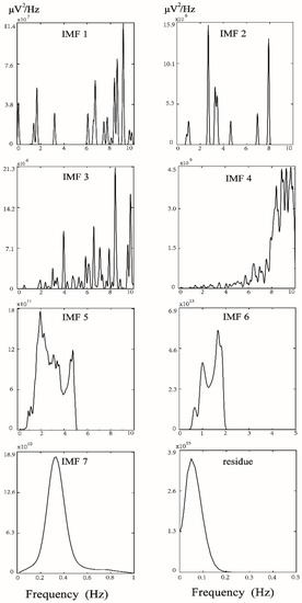 Marginal spectral density of 7 intrinsic mode functions and residue from a healthy subject, presented in Figure 1. Energy distribution analysis for IMF5 and IMF6 showed that their frequency distributions were as between 1–5 Hz. Hence, IMF5 and IMF6 were the noise-free component required in this study.