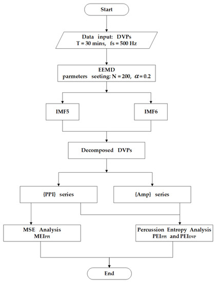 New percussion entropy index (PEIDVP) computation flowchart. Standard deviation of added noise was set as α = 0.2, and trial number was 200 for ensemble empirical mode decomposition (EEMD). As in [21], peak-to-peak interval of the sixth decomposed intrinsic mode function (IMF6) was used for multiscale entropy index (MEIPPI) calculation. After removing high-frequency noise in the original DVP signals, decomposed DVP signals (IMF5 and IMF6) were used for percussion entropy-based index computation.