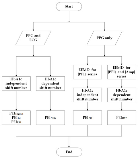 Wei et al. [18] chose nτ = 5 (i.e., HbA1c independent shift number) for PEI1st in accordance with MEISS. However, Xiao et al. proposed a speedy PEI index (PEINEW) [19] and chose nτ = 1 for age-controlled healthy older subjects, nτ = 3 for diabetic subjects with good blood-sugar control (HbA1c < 8), and nτ = 4 for diabetic subjects with poor blood-sugar control (HbA1c ≥ 8) (i.e., HbA1c dependent shift number). Considering surrogate data and cost reduction (ECG was not used), PEIPPI was addressed in [21] with an HbA1c independent shift number. In this study, we followed the latter study in our choice of nτ with an HbA1c dependent shift number after EEMD for {PPI} and {Amp} from decomposed DVP signals, and PEIDVP was subsequently presented (Figure 4).
