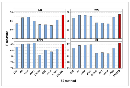 Figure 3 shows the F-measure of the compared methods based on the four used classifiers. In NB classifier, FSS-RRD achieved the maximum average F-measure by 88.5%, while MIGM achieved the minimum score by 82.4%. The proposed method outperformed other methods in the range from 1.5% to 6.1%. Similarly, FSS-RRD achieved the maximum average F-measure using SVM by 88.9%, while MIGM achieved the minimum score by 83.5%. The proposed method outperformed other methods in the range from 0.5% to 5.4%. According to KNN classifier, WRFS achieved the maximum average F-measure by 87.7%, while CMIM3 achieved the minimum score by 81.6%. The proposed method achieved the fourth-best position in this case. In DT classifier, FSS-RRD achieved the maximum average F-measure by 87.5%, while MIGM achieved the minimum score by 82.3%. The proposed method outperformed other methods in the range from 0.7% to 5.2%.