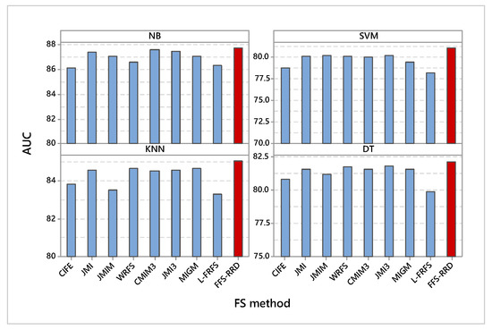 It is obvious that the proposed method achieved the highest AUC compared with other methods using all classifiers (Figure 4). According to NB, FSS-RDD achieved the maximum AUC by 87.8%, while CIFE achieved the minimum AUC by 86.2%. The proposed method outperformed other methods in the range from 0.2% to 1.6%. In SVM classifier, FSS-RDD also achieved the maximum AUC by 81.1%, while L-FRFS achieved the minimum score by 78.2%. The proposed method outperformed other methods in the range from 0.9% to 2.9%. Similarly, FSS-RDD also achieved the maximum AUC using KNN by 85.1%, while L-FRFS achieved the minimum score by 83.3%. The proposed method outperformed other methods in the range from 0.4% to 1.8%. Using DT classifier, FSS-RDD kept the best method by 82.2%, L-FRFS kept the worst method by 79.9%. The proposed method outperformed other methods in the range from 0.4% to 2.3%.