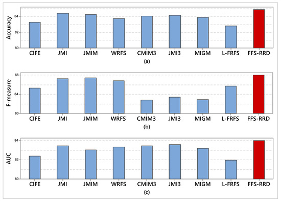 Figure 5 shows the average score of the four classifiers in terms of accuracy, F-measure, and AUC. For accuracy term, FFS-RRD achieved the highest accuracy for all classifiers by 84.9%, followed by JMI, JMIM, JMI3, CMIM3, MIGM, WRFS, CIFE, and L-FRFS by 84.4%, 84.3%, 84.2%, 84.1%, 83.9%, 83.8%, 83.3%, and 82.8%, respectively. The proposed method outperformed other methods in the range from 0.5% to 2.1%. Similarly, FFS-RRD achieved the highest average of F-measure by 87.6%. Then, JMIM achieved the second-best method, followed by JMI, WRFS, L-FRFS, CIFE, JMI3, MIGM, CMIM3 with score 87.4%, 87.3%, 86.8%, 85.7%, 85.7%, 85.3%, 83.4%, 83.9%, 82.8%, respectively. The proposed method outperformed other methods in the range from 0.2% to 4.7%. According to AUC, FFS-RRD achieved the highest AUC with a score 84.0%. JMI3 achieved the second-best method, followed by JMI, CMIM3, WRFS, MIGM, JMIM, CIFE, and L-FRFS by 83.6%, 83.5%, 83.4%, 83.3%, 83.2%, 83.0%, 82.4%, and 81.9%, respectively. The proposed method outperformed other methods in the range from 0.4% to 2.1%.