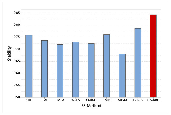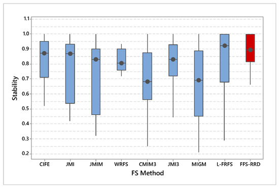 Figure 6 shows the average stability across the first half thresholds on all datasets. FFS-RRS achieved the maximum average of stability by 84.3%, while MIGM achieved the minimum score by 67.9%. After that, L-FRFS achieved the second-best method by 78.6%, followed by JMI3, CIFE, JMI, WRFS, CMIM3, and JMIM with an average score 76.0%. 75.8%, 73.5%, 73.0%, 72.3%, and 71.9%, respectively. The proposed method outperformed other methods in the range from 5.7% to 16.4%. Figure 7 shows a box-plot of average stability for all compared methods on the median threshold. In box-plot, the black circle represents the stability median, while the box represents both lower and upper quartiles. As shown in the box-plot, the stability result of the proposed method is better and more consistent than compared methods.