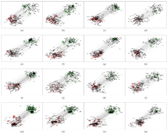 Network representation of mTE results for cryptocurrency variables. The green nodes represent price-return variables, while the red nodes represent volume-return variables. The subfigures (a–p) show the directed network results for the time window under study. The subfigures are arranged in temporal order from top-left to right-bottom.