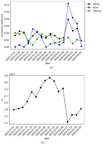 Figure 2a shows the overall clustering coefficient as a function of time for the networks associated with each time window of the data set. The black dotted line are the results for the whole networks (i.e., volume-return and price-return nodes), whereas the blue and green dotted lines represent the results for the price-return and volume-return nodes, respectively. It is remarkable the peak in the clustering coefficient for the time window ending at 2020-03-15, especially in the price-return subnetwork and in less amount for the whole network.