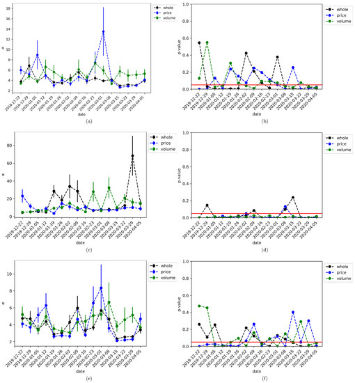 Let analyze first the degree distribution case. As can be seen from Figure 3a there is a peak at 2020-03-01 for the price-returns subgraph, where the estimated fit of the degree distribution is , whereas the whole and volume-returns degree distribution is adjusted with a power oscillating below eight. Figure 3b tells us that the adjustment is not significant most of the time, where we can see p-values over the threshold of 0.05 (red line). Nevertheless, the peak at 2020-03-01 for the price-returns is at the border of significant fitness. In a similar way, Figure 3c shows the estimated power behavior for the in-degree distribution, where now there exists an abrupt change at 2020-03-29 for the whole network with an estimated . In this scenario, the adjustment is significant most of the time as can be seen in Figure 3d. Finally, Figure 3e,f shows the corresponding results for the out-degree distribution, being all the estimated power below nine, but without a significant pattern.