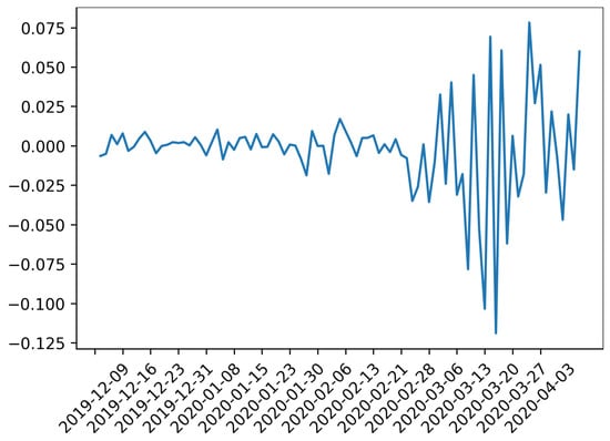 In short, these results confirm what was found in the previous subsection, in the sense that the change in the estimated power of the degree distribution of the price-returns anticipates the fall of the average market capitalization of cryptocurrencies occurring at 2020-03-15. Particularly, the in-degree distribution shows the most robust results in the sense of statistically significant evidence of a peak at end of March for the whole network. Then, it is a better indicator of the complex properties of the mTE network. It is important to keep in mind that during March the global markets become extremely turbulent because of the COVID-19 pandemic and the subsequent crash of oil prices around the world. As a matter of fact, during the period of time under study the All Country World Index (ACWI) fell around 10% on a single day, which is its largest decline since 2008. This index published by Morgan Stanley Capital International or MSCI inc. is a market capitalization-weighted index designed to provide a broad measure of equity-market performance throughout the world taking into account stocks from 23 developed countries and 24 emerging markets [59]. As such it is an adequate thermometer of the world financial situation. In Figure 4 it is shown the daily log-returns for the time window from 2019-12-02 to 2020-04-06 (data are taken from [60]). There can be seen the financial turbulence start at the end of February and reach its highest volatility at the middle of March, which coincide with the lowest point of the market capitalization of Figure 2b Hence, based on the evidence found in this study, it is argued that periods of economic contractions are preceded by a high power law distribution of node degrees for price-returns. Nevertheless, it is necessary to develop extensive studies between global financial indices and cryptocurrencies to properly justify this hypothesis.