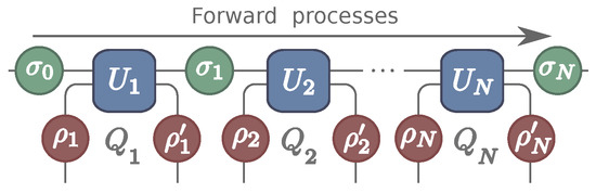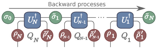 To construct the fluctuation theorem, we must now establish the backward process. As shown in [19], however, there is an arbitrariness in the choice of the initial state of the backward process; different choices lead to different definitions of the entropy production. Here we are interested specifically in heat and the generalization of the Jarzynski–Wójcik fluctuation theorem [7]. Hence, we assume that in the backward process both system and ancillas are fully reset back to their thermal states. As usual, the time-reversed interaction between now takes place by means of the unitary . However, the order of the interactions must now be flipped around, as shown in Figure 2. More about the choice of backward process can be found in [20,21] and its relation to the notion of recovery maps is discussed in [22].