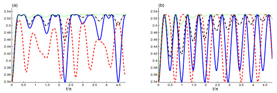 The Wehrl entropy (WE) for for the different cases: (solid curves), (dash curves), (dashed-doted curves) and (doted curves) for in (a) and in (b).