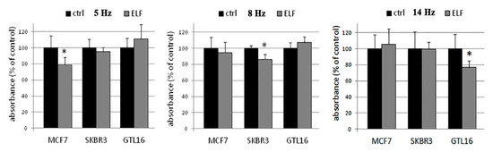 The results are summarized in Table 1, where three different tumoral cellular lines have been considered [26]: two human breast cancer cell lines both growing in epithelial-like clusters (MCF7 and SKBR3) and one human gastric cancer cell line (GTL16). The two breast cancer lines’ results different in their oncogene expression and estrogen stimulation, and they present different geometry, shapes, and characteristics; in particular, MCF7 is the most commonly used breast cell line [27], especially as concerns the studies of hormone response [28]. GTL16 is a gastric carcinoma cell line with a morphology that is typically round shaped. This cell line presents a rapid growth and the overexpression of the MET oncogene [29,30]. It is possible to highlight that the electromagnetic waves induce a different behavior in the cancer cells considered; indeed, they decrease their growth if compared with the cancer cells outside of the electromagnetic field as shown in Figure 1, proving that there exists a forcing phenomena of heat flux control that controls the related ions fluxes and, consequently, induces a different behavior to the biosystem.