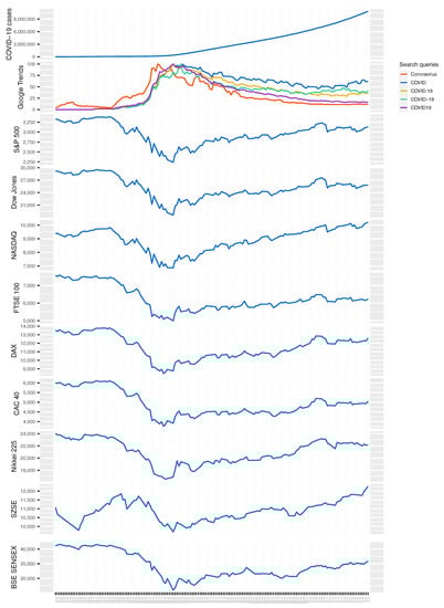The strategy to use Google search queries to capture information search, attention, or, equivalently, risk perception, is consistent with prior literature and concurrent work on COVID-19 [8,9]. In particular, Google Trends, which provides data on Google search queries, has recently been used in finance [10], financial economics [11], monetary economics [12,13], and labor economics [14,15], among others. Furthermore, Google Trends data have also been shown to help predict home sales, automotive sales, and tourism [16]. Ginsberg et al. [17] document strong correlation between influenza epidemics and individuals’ health-seeking behavior in the form of online search queries. In essence, COVID-19-related search queries serve as a proxy for the demand for information about the virus which reflects an individual’s level of concern about the subject. Thus, the higher the search share, the higher the perceived risk among the population. This potentially leads to more intense financial market activities due to hedging against perceived risk. As Tett [18] noted it, in light of growing importance of online search activities, individuals and investors can manage and track investment returns with growing precision by plugging into online platforms. The time series plots of global Google search queries related to COVID-19 and financial market indices (see Figure 1) provide anecdotal evidence in support of this hypothesis: search queries (especially, those containing the term “Coronavirus”) and financial market indices are largely a mirror image of each other about the time axis.