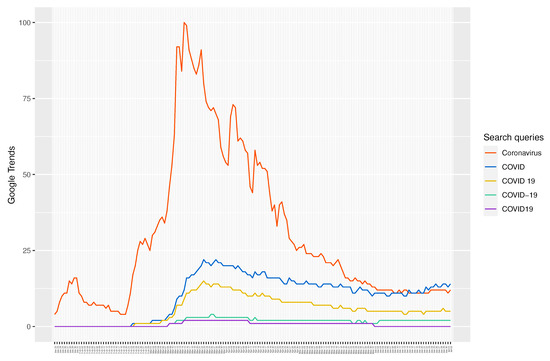Relative trends of five Google search queries between 22 January 2020, and 2 July 2020. Google Trends shows the popularity of global search queries containing the term “Coronavirus”, “COVID”, “COVID 19”, “COVID-19”, or “COVID19”, which are commonly used to refer to the novel coronavirus. A value of 100 is the peak popularity for a search query, while a value of 0 is the lowest popularity.