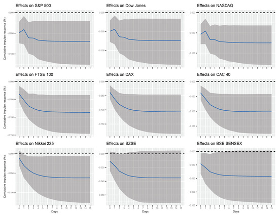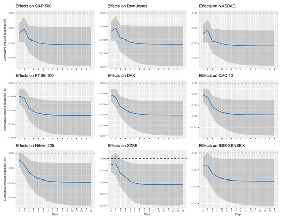 Cumulative effects of total Google search queries related to COVID-19 on financial market indices (with as an additional exogenous variable). The solid lines correspond to the Bayesian estimates, while the shaded regions represent 95% credible intervals. Total Google search queries is the sum of five search queries: “Coronavirus”, “COVID”, “COVID 19”, “COVID-19”, and “COVID19”.
