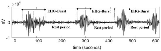 Representative signal of an electrohysterogram (EHG) recorded from the abdominal surface of a pregnant participant in active labor. Uterine contractions are associated with electrical EHG bursts of action potentials.