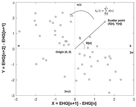Subsequently, we constructed the SODP of EHG as a scatter plot of against . Then, we computed the slope angle of each scatter point from the origin , as shown in Figure 2. The entire plot (from 0 to ) is split into sectors having an angle span of radians each. The value serves as a coarse-graining parameter characterizing how slender a sector is. In Figure 2, a four-quadrant SODP is presented as an example (). In this exploratory study, we set the value from , because it is a similar range proposed by Rohila and Sharma for exploring the stability of the parameter k. According to them, for the computation of PhEn it is convenient to select a value that is divisible by 4 [13].